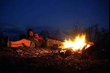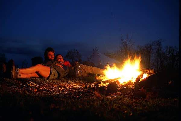 Two honeymooners relaxed next to their fire on a bald mountain top called Beauty Spot.